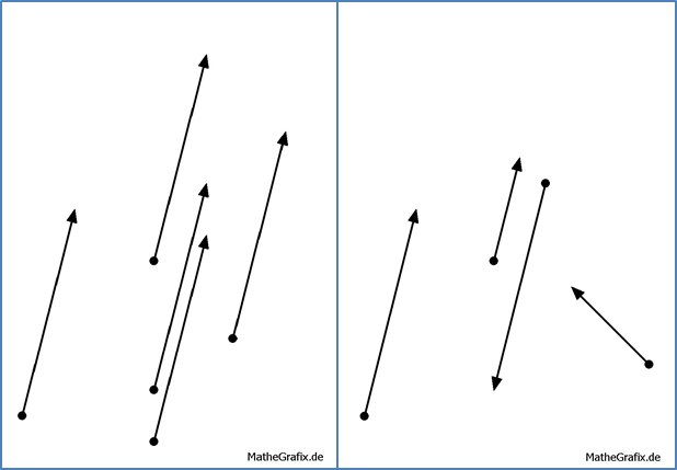 Auf der linken Seite der folgenden Grafik sehen Sie fünf Pfeile, die alle die gleiche Länge, die gleiche Richtung und die gleiche Orientierung haben. Es ist also ein Vektor dargestellt. Anfangs- und Endpunkt spielen dabei keine Rolle. Die Pfeile auf der rechten Seite unterscheiden sich hinsichtlich Länge, Richtung und/oder Orientierung. Hier sind also vier verschiedene Vektoren symbolisiert.